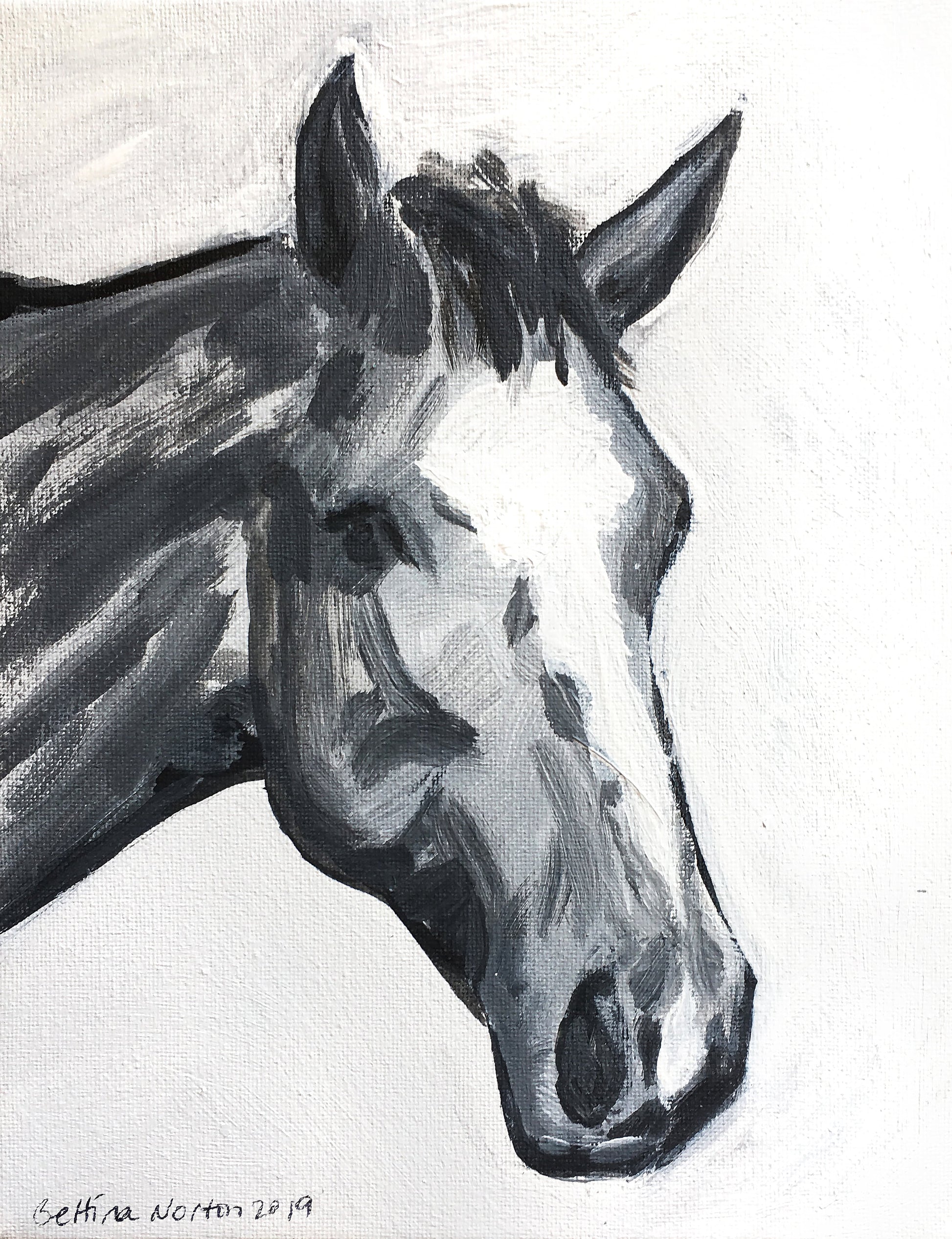 What a pretty girl! With her wild-child mane and mellow vibe, she has been loving living in the outdoors and it seems to suit her well. Even when not ridden in 18+ months she is mellow, relaxed and a trooper, popping over crossrails, and being a generally great ride. With cute, oversized ears and a flashy blaze - I had a blast painting her! Thank you Ellyse!!