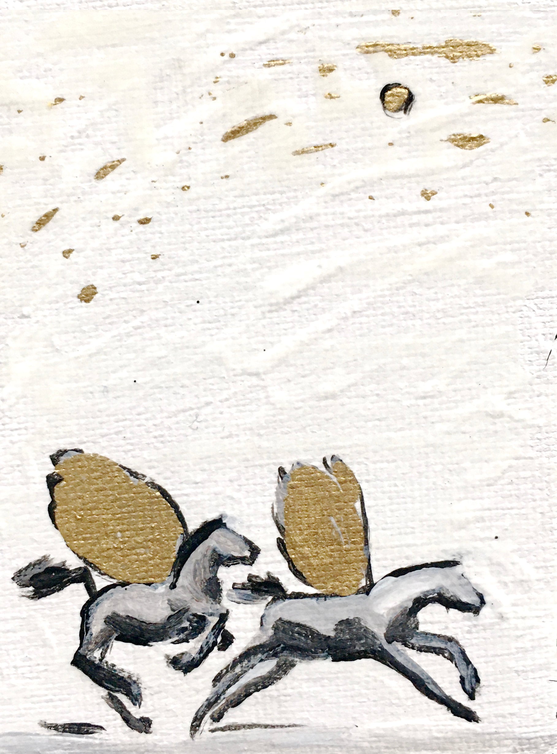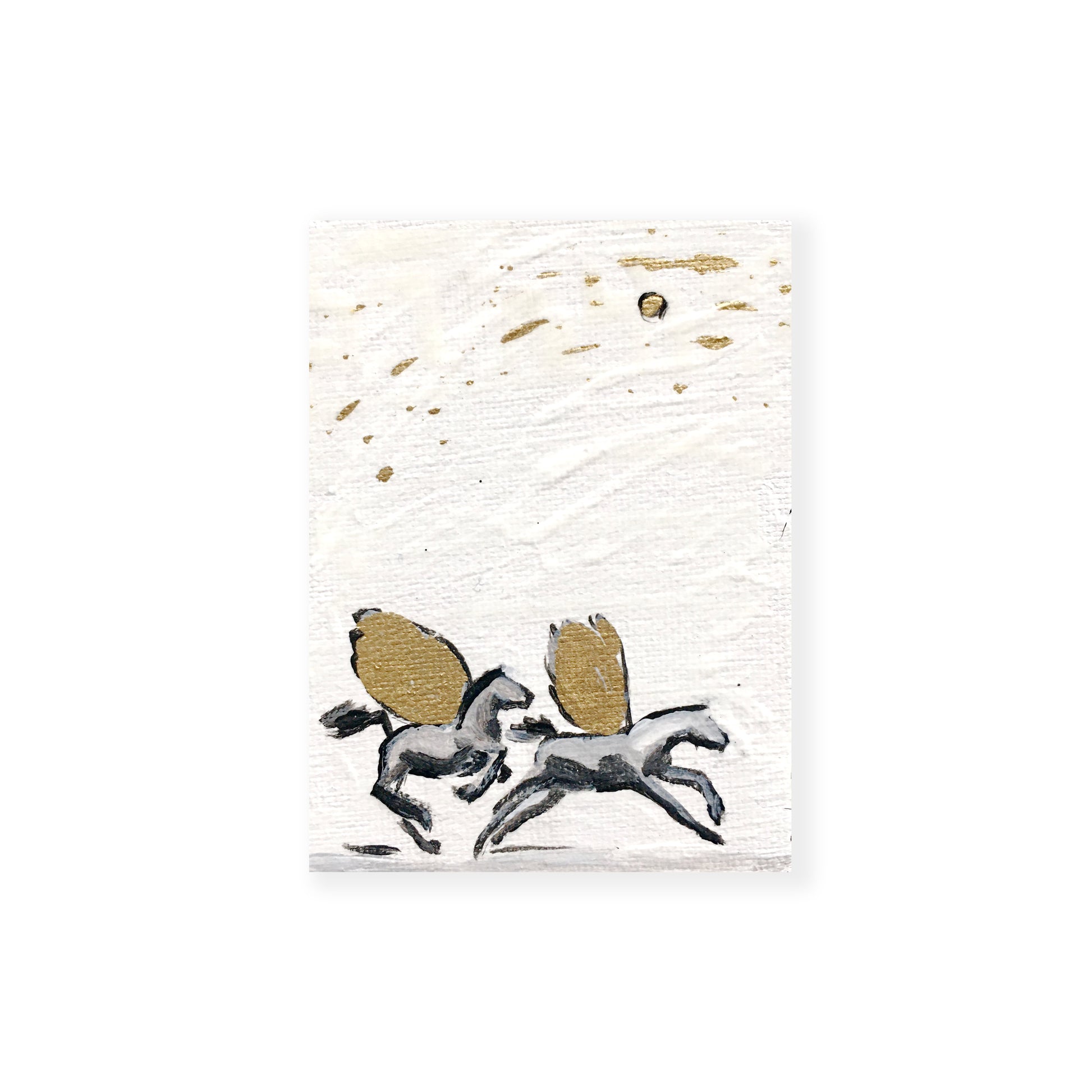 - Acrylic, ink, gold leaf and ink under varnish, beautiful for years to come.