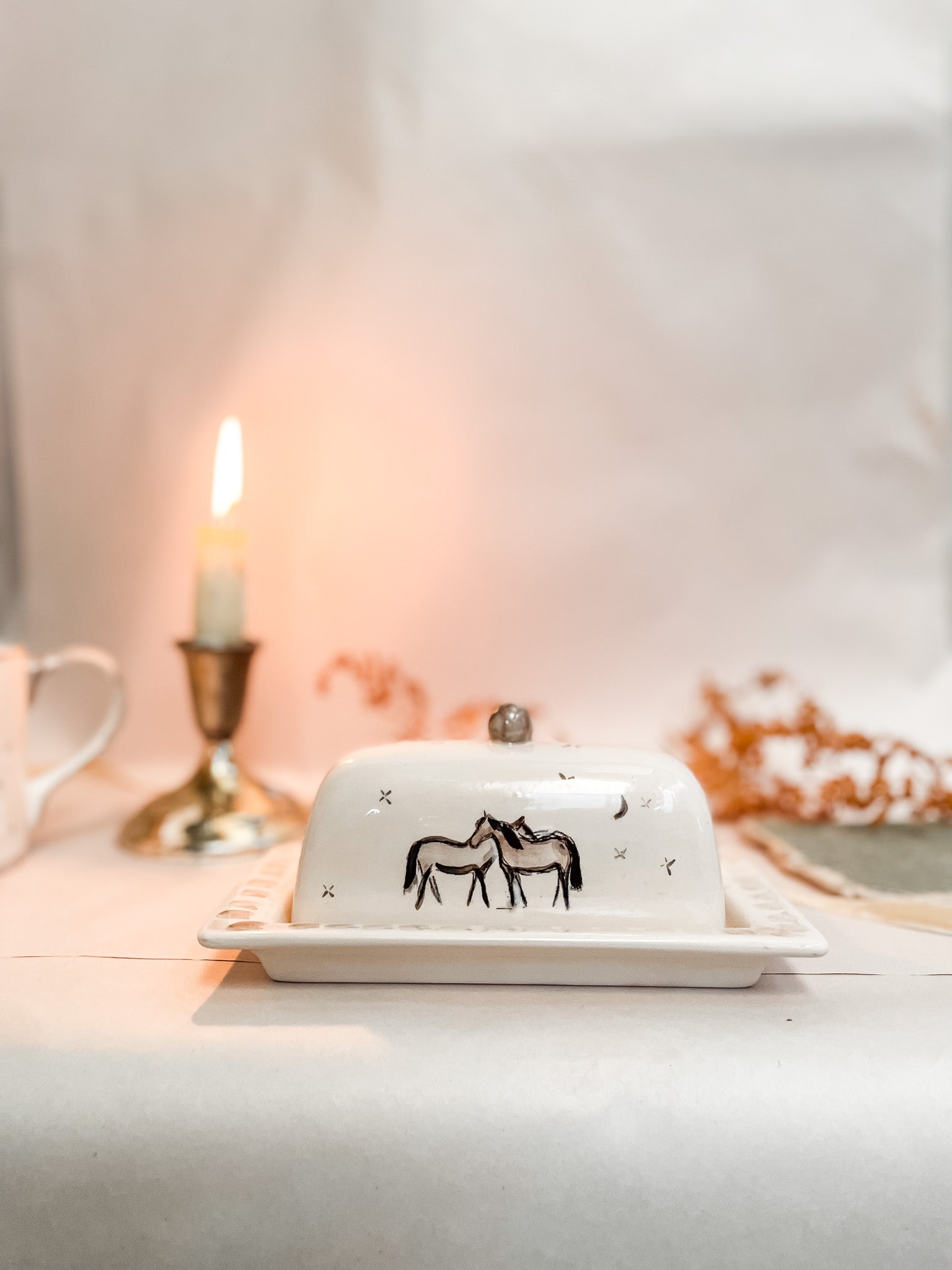 Elevate everyday moments with this ceramic butter dish, hand-painted with original artwork by Bettina.