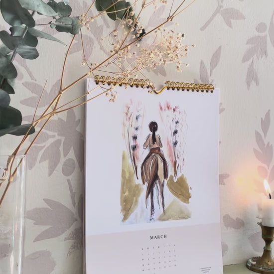 Printed in full color on warm white text paper, this calendar is bound with a brass spiral and hanger for effortless display. A center notch allows for easy wall-hanging wherever you like — your kitchen, studio, hallway, or office.