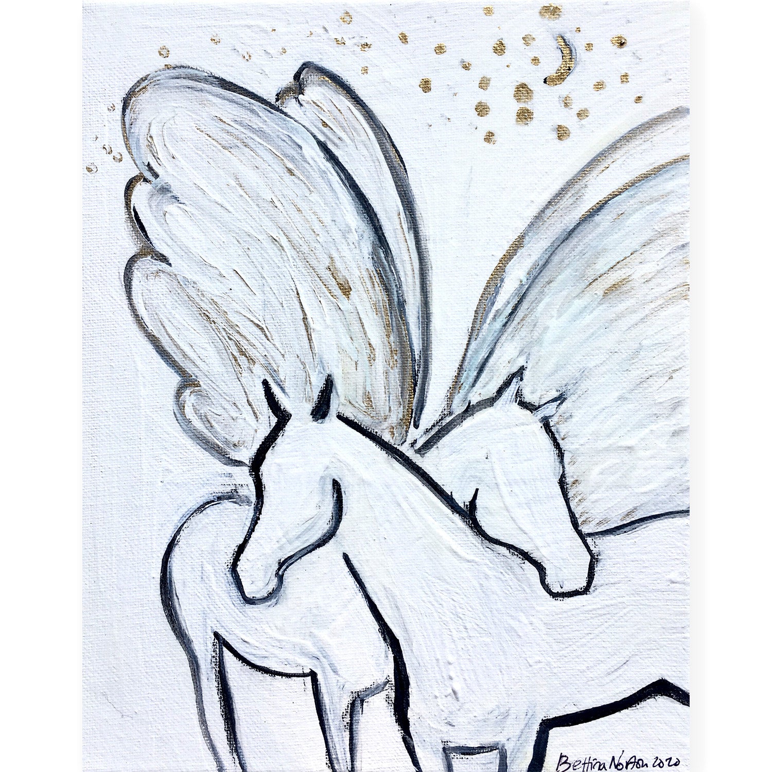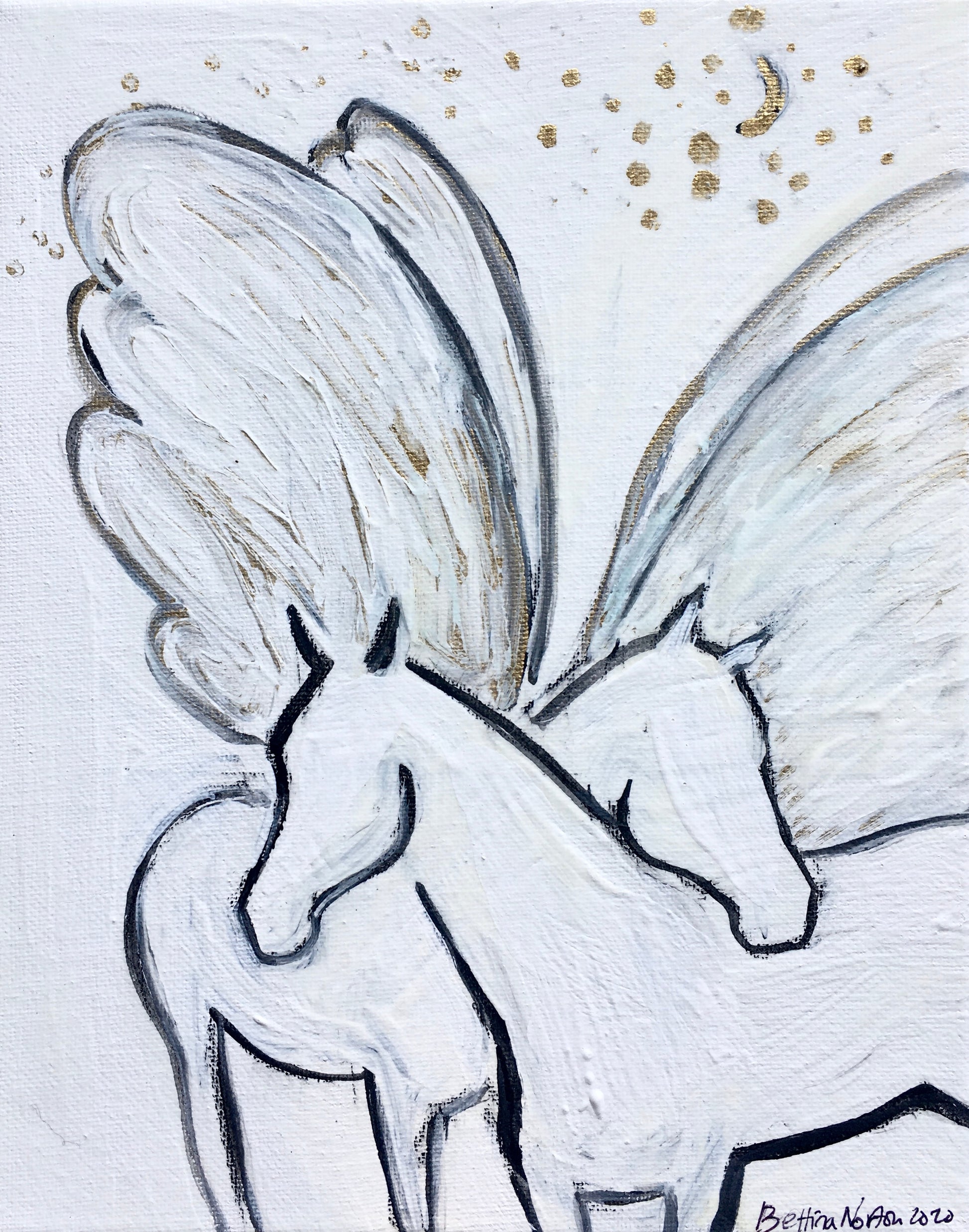 - Acrylic, ink, gold leaf and ink under varnish, beautiful for years to come.
