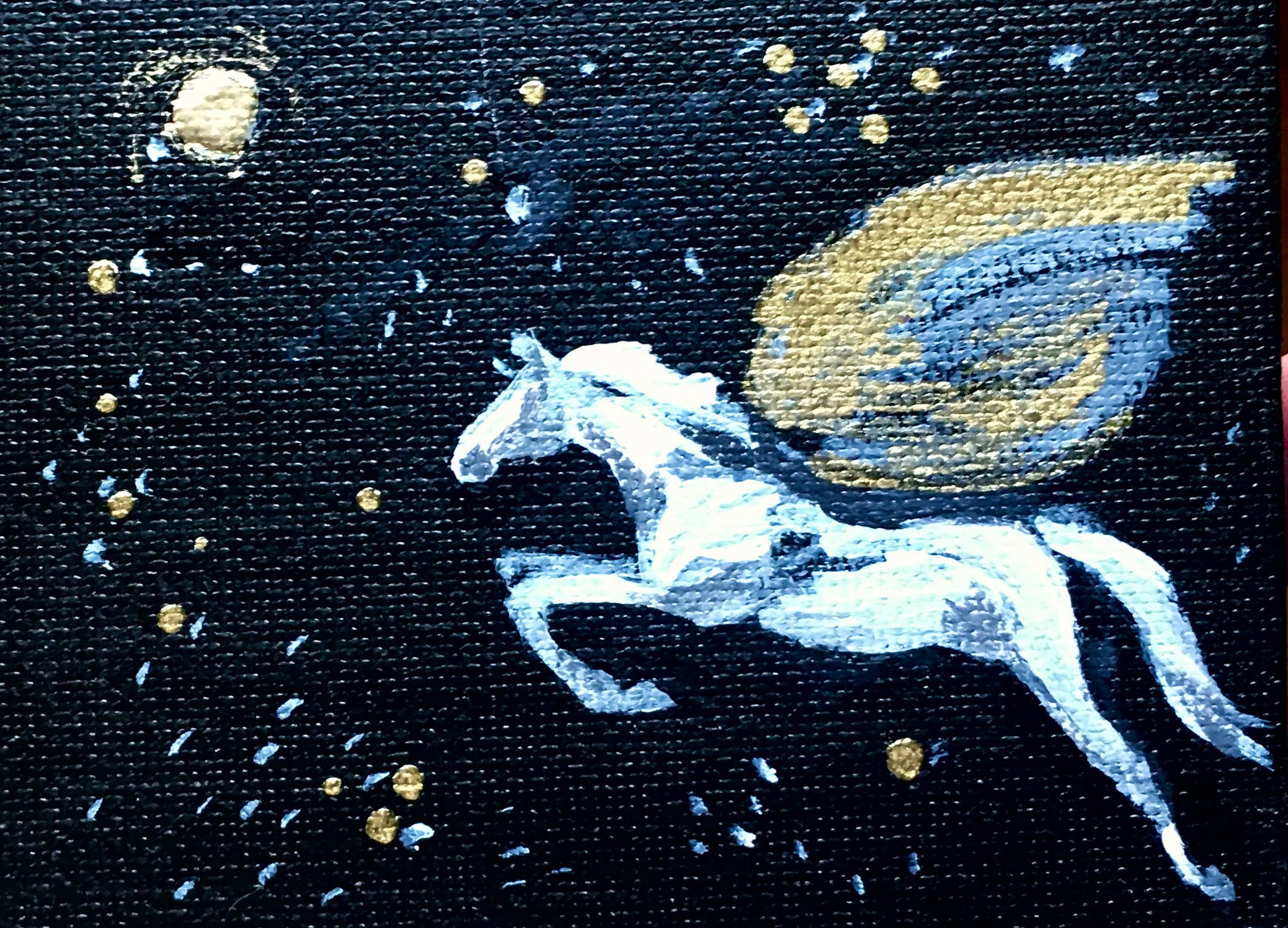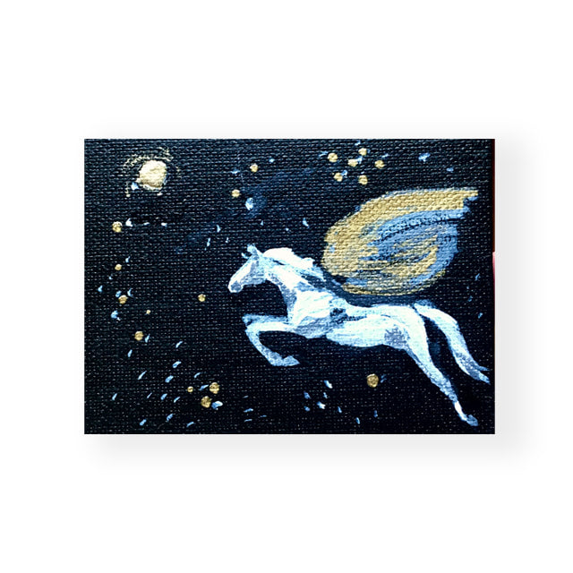 - Acrylic, ink, gold leaf and ink under varnish, beautiful for years to come.