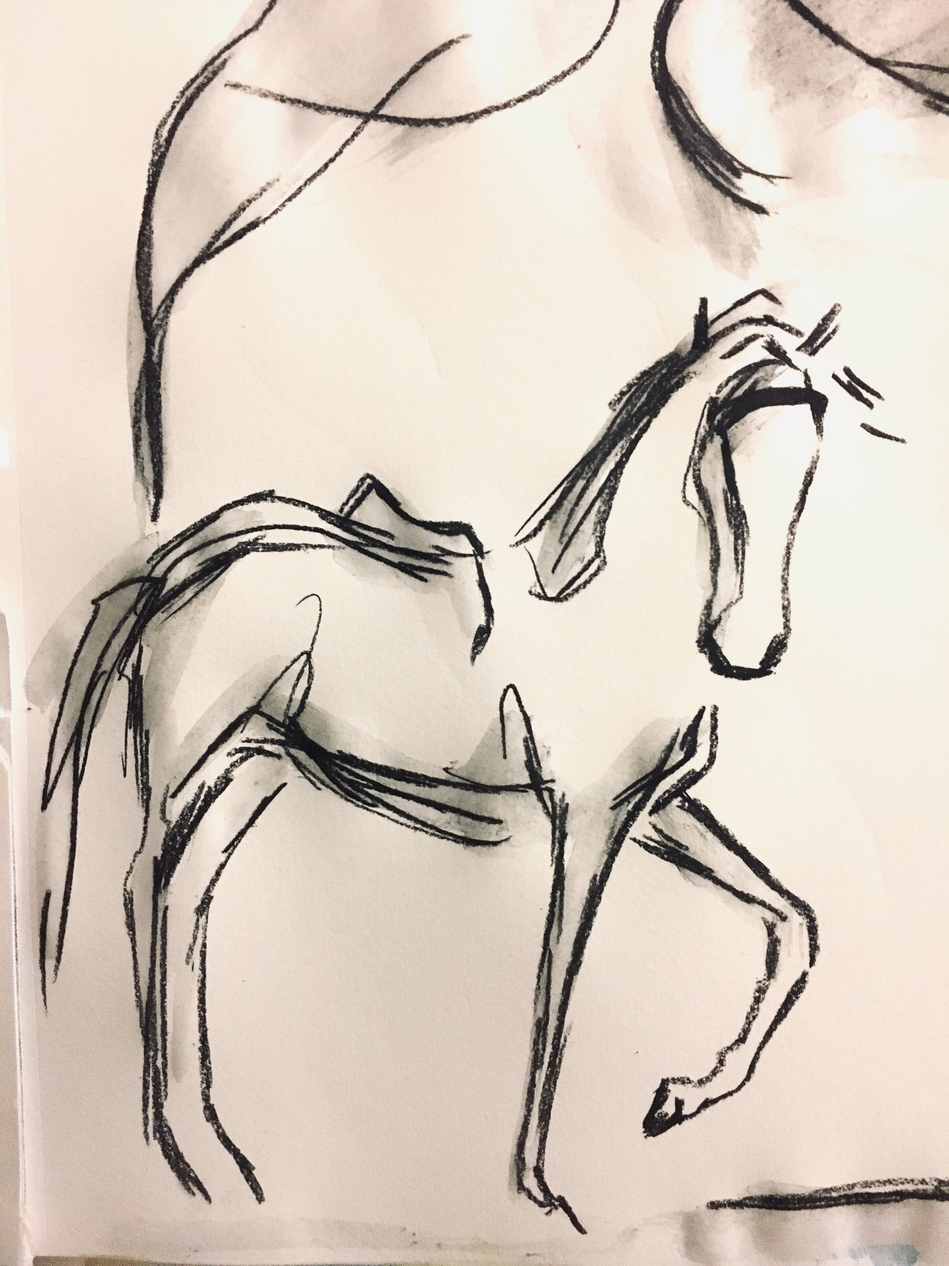 Ink, charcoal and acrylic on art paper with a gold leaf mane and tail.
