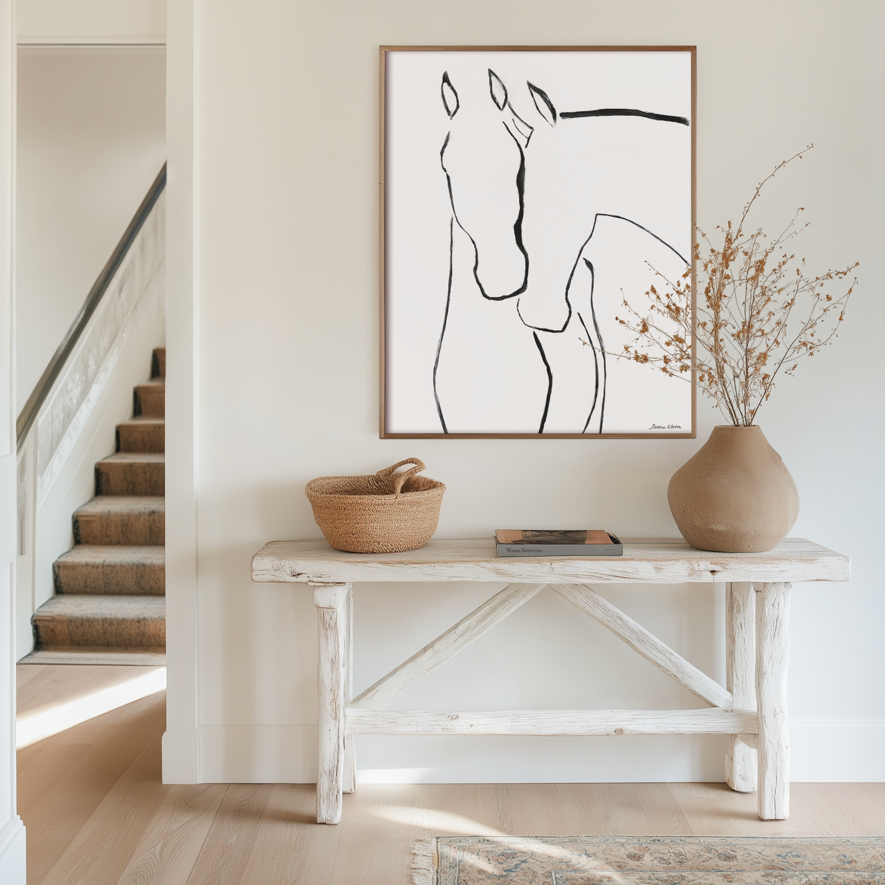 We placed this piece at the end of our staircase so every time we go to our bedroom we see it. Every day Held makes us smile and ask who is which horse in the painting today. The one holding or the one being held. Beautiful!