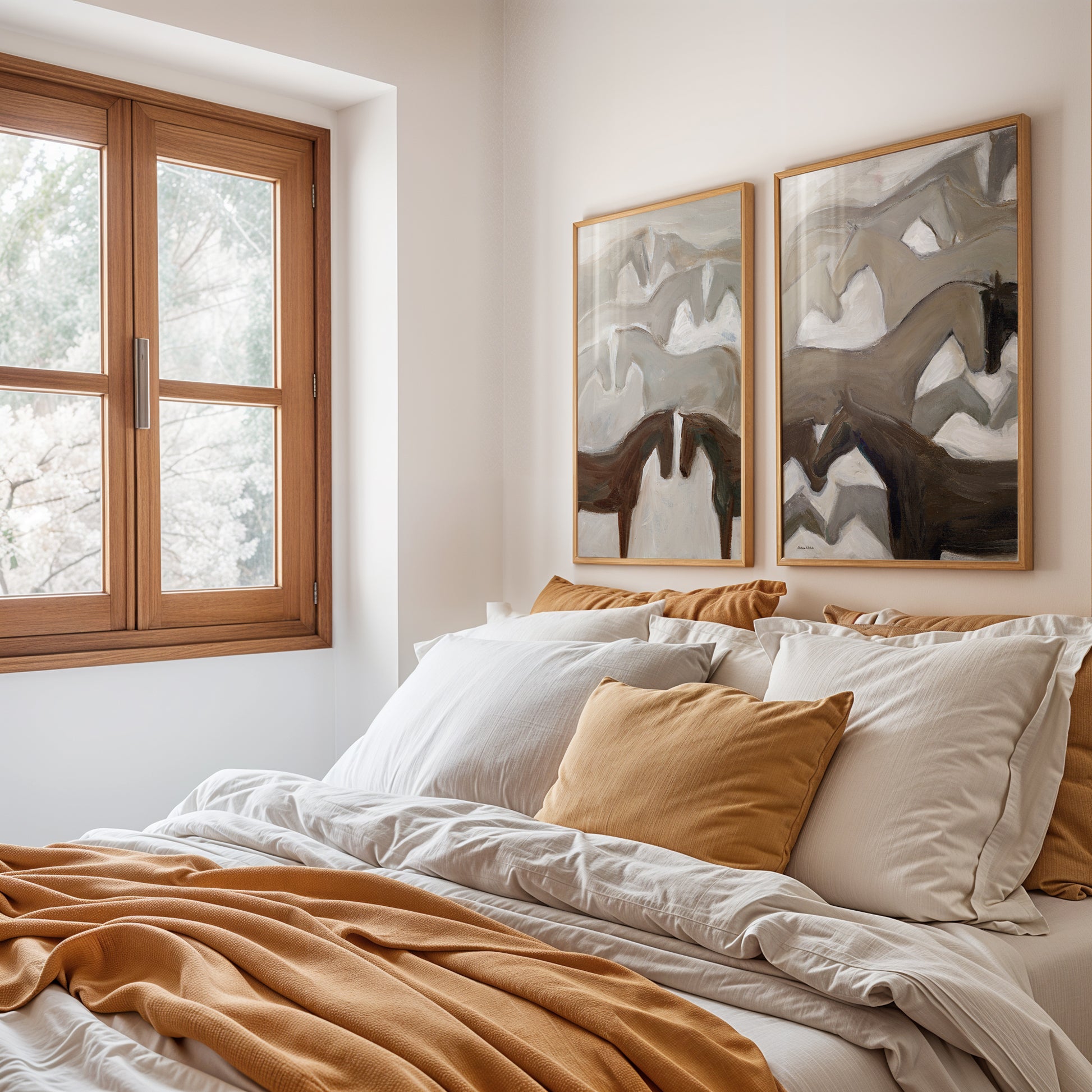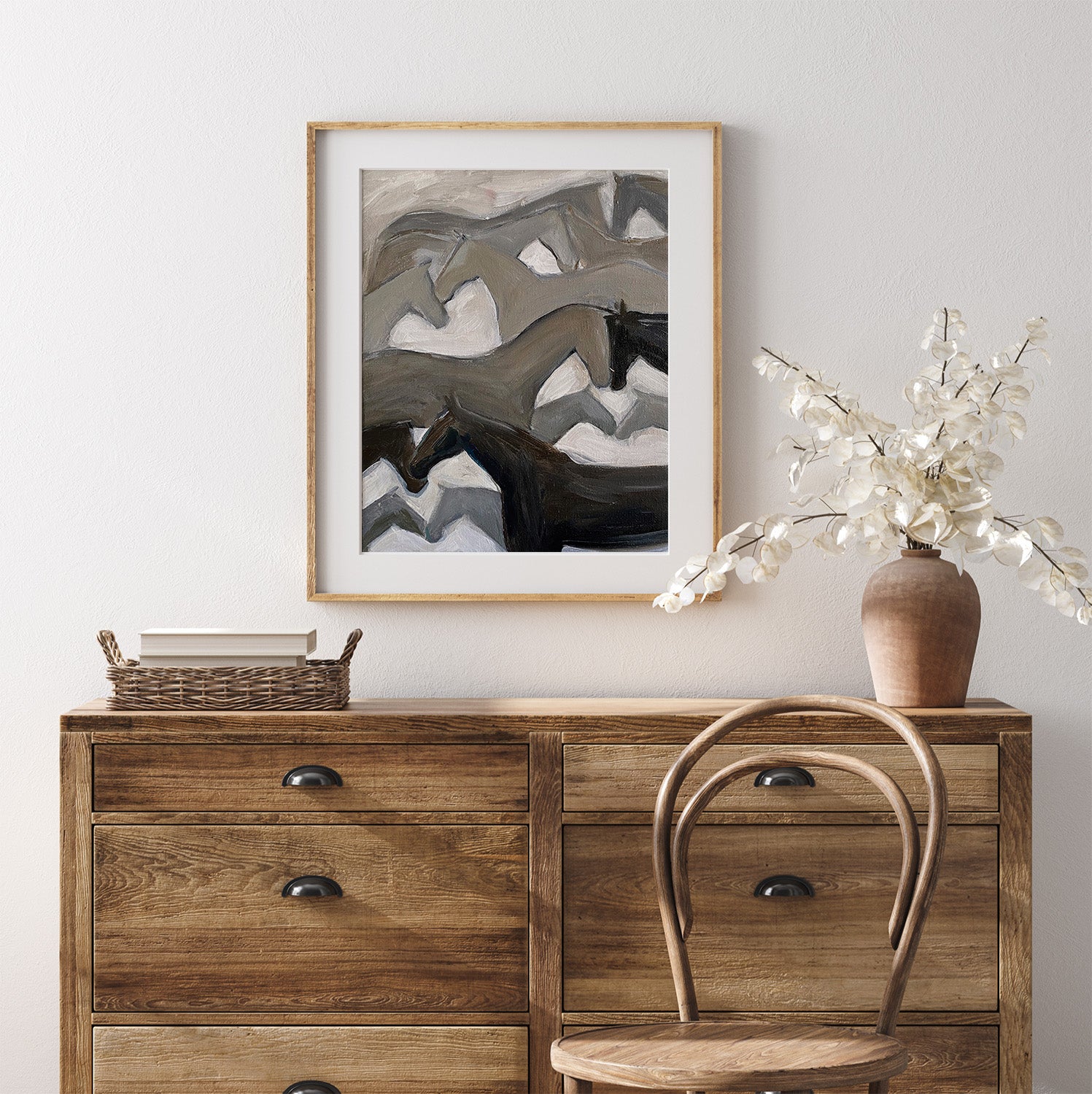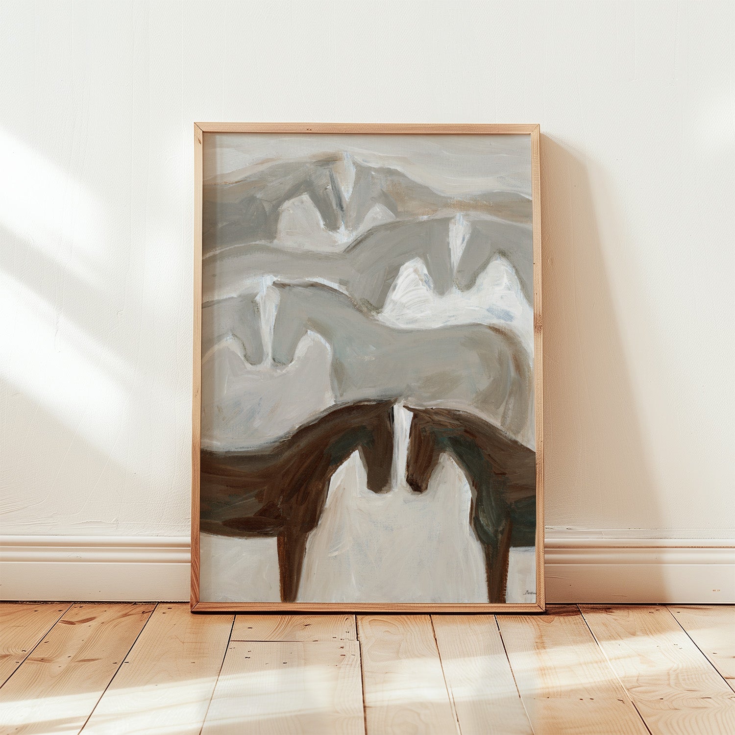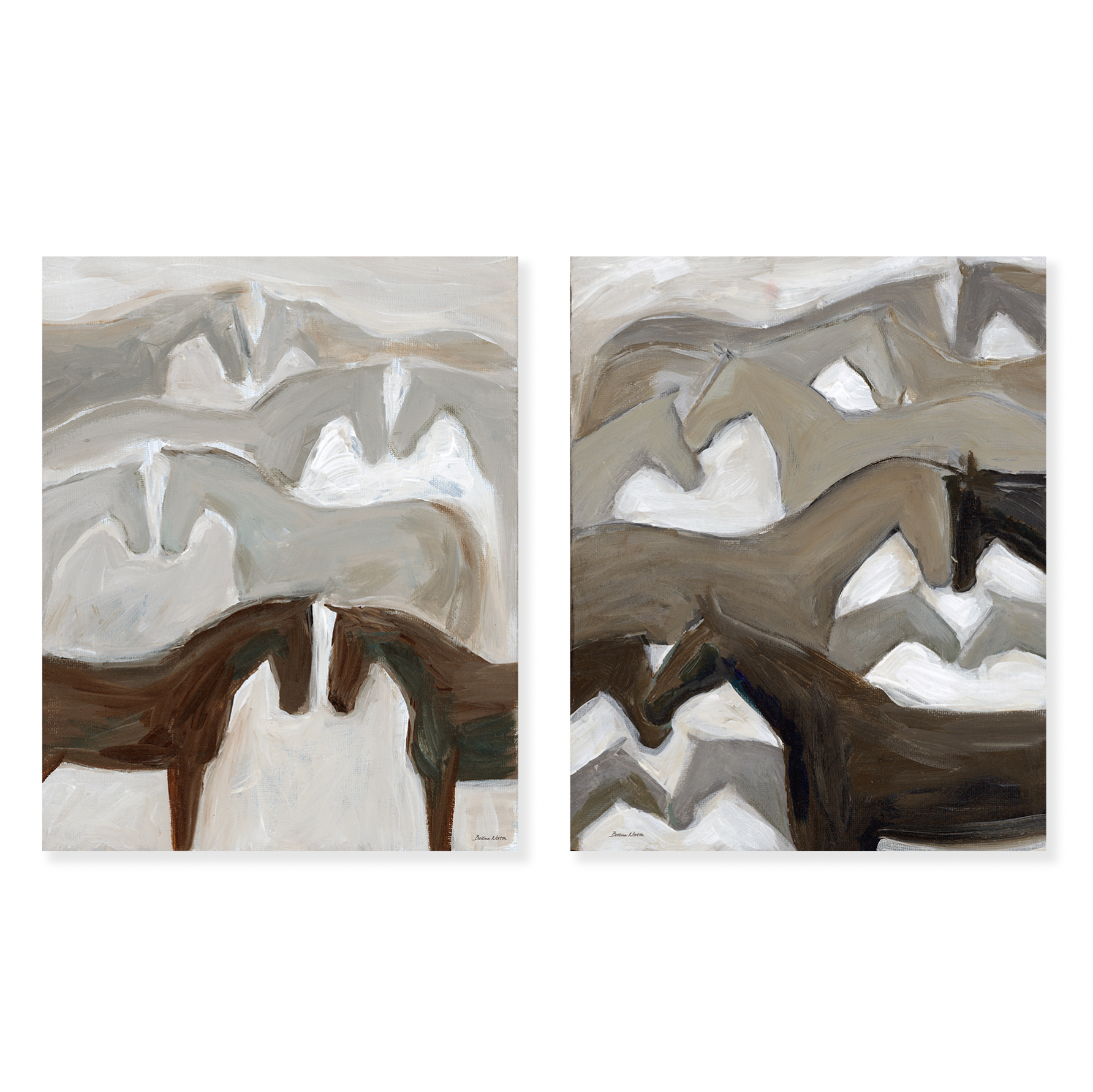 Inspired by long days hiking in the California mountains, they evoke the warmth of sunbaked stone and the layered textures of the earth — like herds of horses moving across the desert landscape.