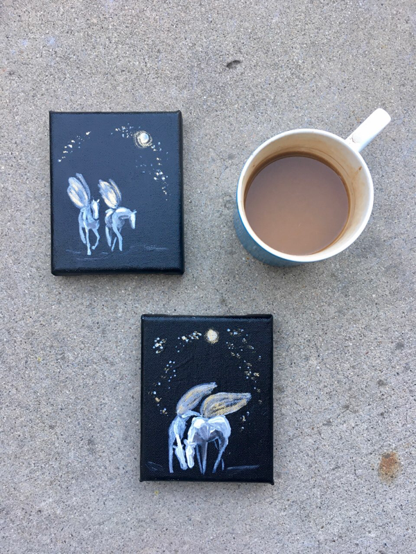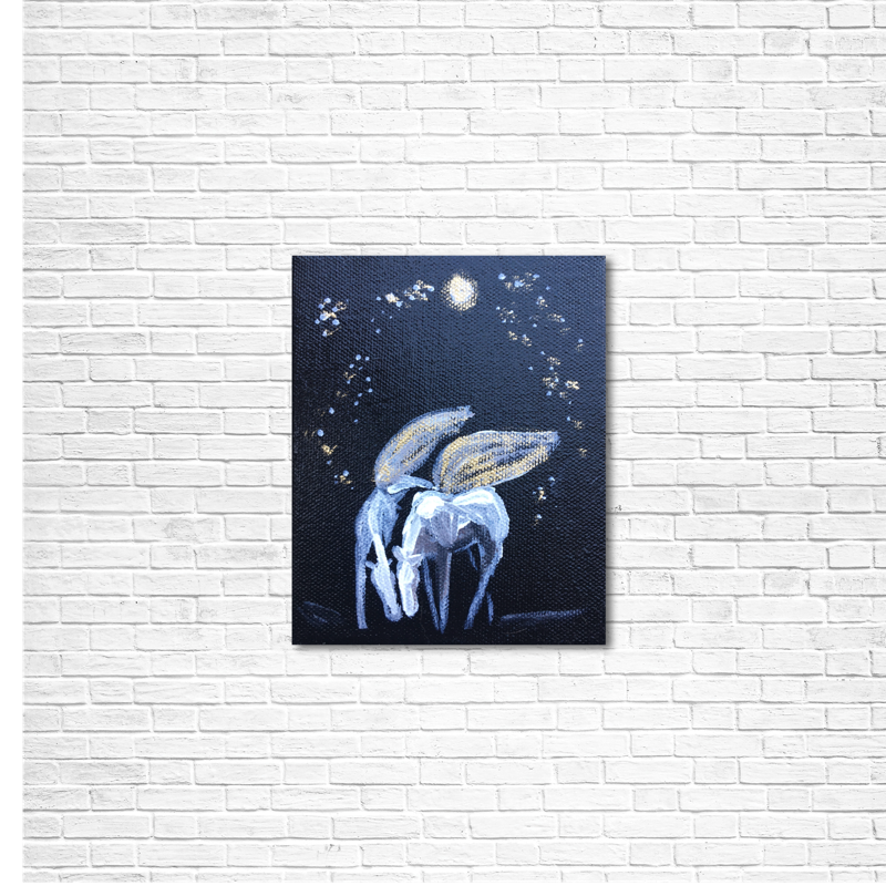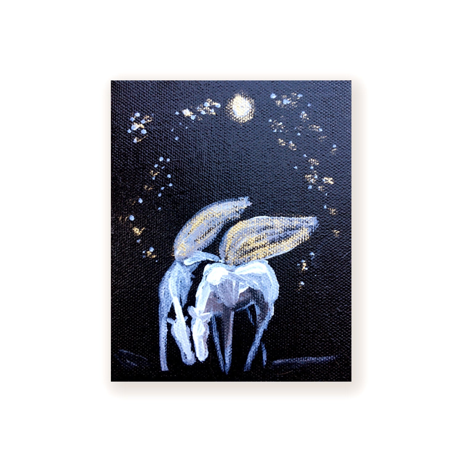 - Acrylic, ink, gold leaf and ink under varnish, beautiful for years to come.