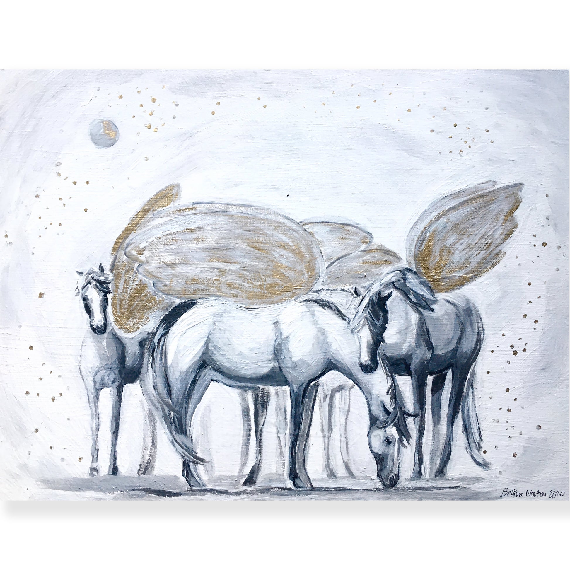 - Acrylic, ink, gold leaf and ink under varnish, beautiful for years to come.