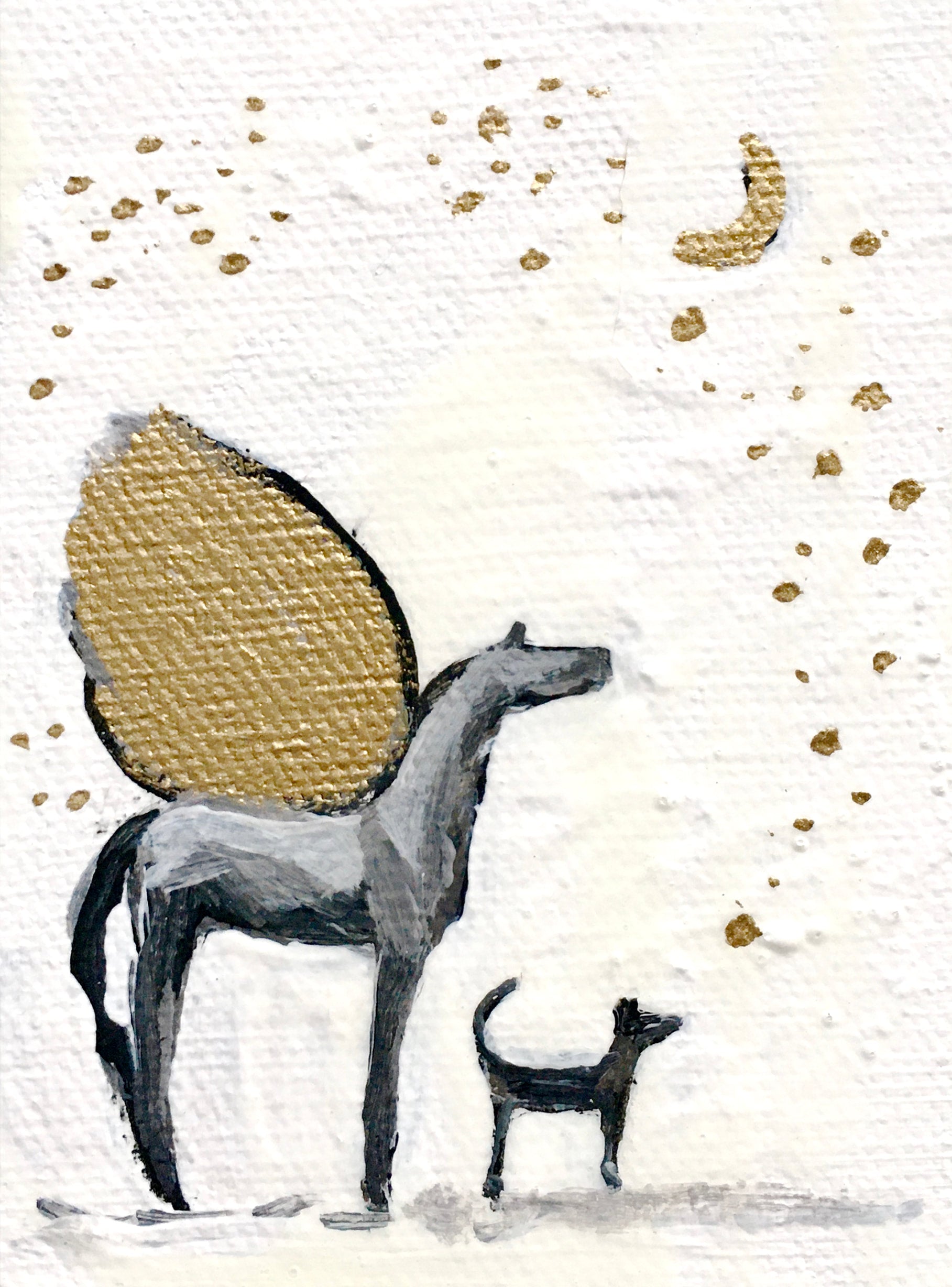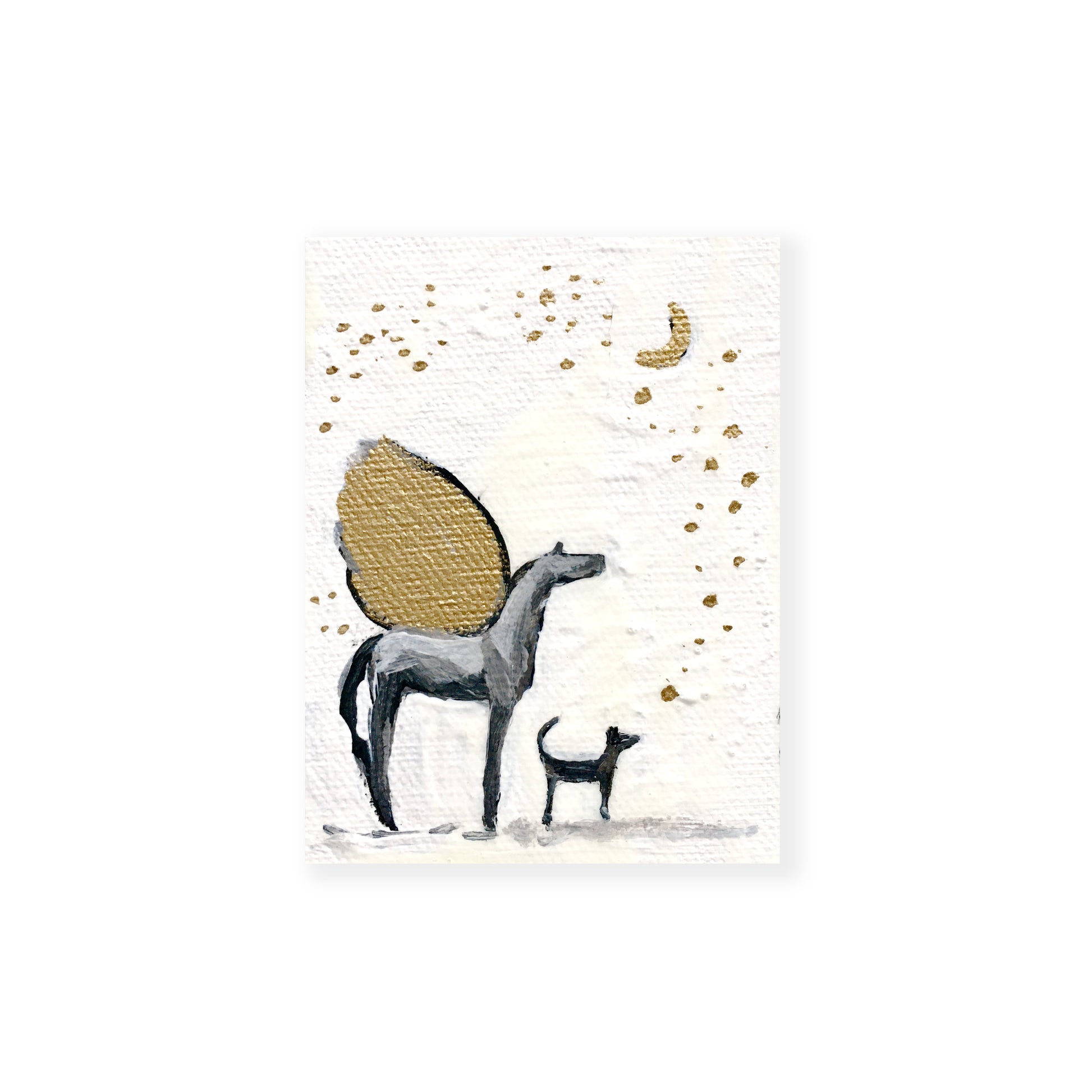 - Acrylic, ink, gold leaf and ink under varnish, beautiful for years to come.